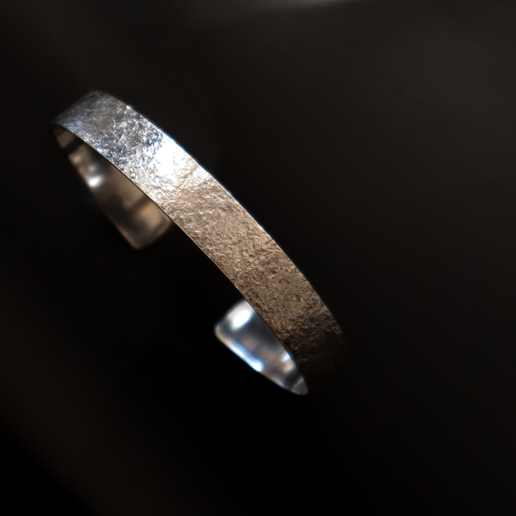 Feito em prata reciclada e 950, esse bracelete tem superfície irregular, marcada por marteladas.